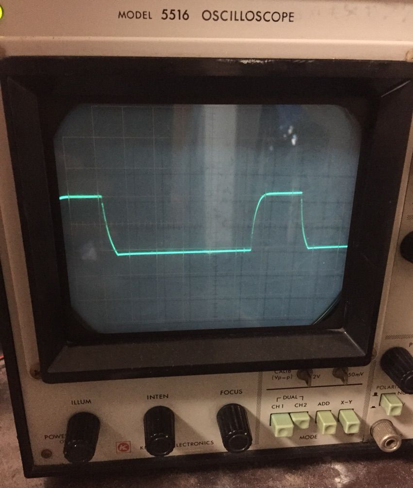 上の緑のミノムシの付いてる所の波形です。変な形です。謎です。お城は動作確認に便利ですね。