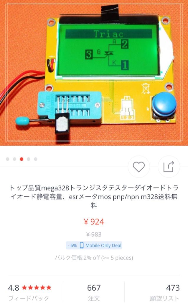素子の種類などが分かる便利なテスターです。Aliで850円くらい(為替の変動で値段が変わります)でした。